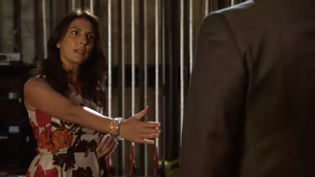 Vestido floral de Eliza J usado por Sophie Devereaux (Gina Bellman) como se ve en el vestuario del programa de televisión Leverage (Temporada 3 Episodio 16)