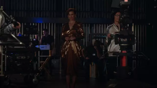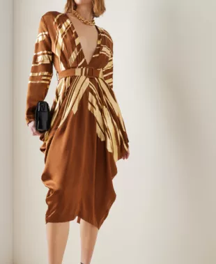 Material Vestido Midi de satén cubierto con cinturón para mujer en marrón usado por Amber Gemstone (Cassidy Freeman) como se ve en The Righteous Gemstones (S03E09)