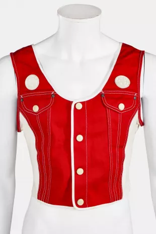 Chaleco Converse rojo y blanco para hombre de Jean Paul Gaultier usado por Megan Forte Clarke como se ve en Love Island (S12E10)