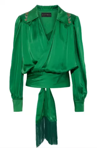 Dundas Fringe-Trimmed Appliquéd Satin Wrap Blusa usada por Dottie Cantrell Roman (Susan Sarandon) como se ve en Monarch (S01E05)