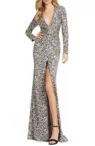 Mac Duggal Cheetah Vestido de trompeta usado por Crystal Kung Minkoff como se ve en The Real Housewives of Beverly Hills (S12E21)
