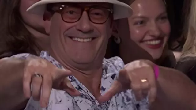 SNL 51 Jon Hamm Conjunto de pantalones cortos con gráficos azules usado por (Jon Hamm) en Saturday Night Live 2025