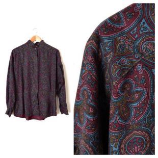 Vintage Paisley impression fin des années 80 pour homme chemise, Structure, violet avec turquoise et jaune ocre, quelques pertes, marqué XL
