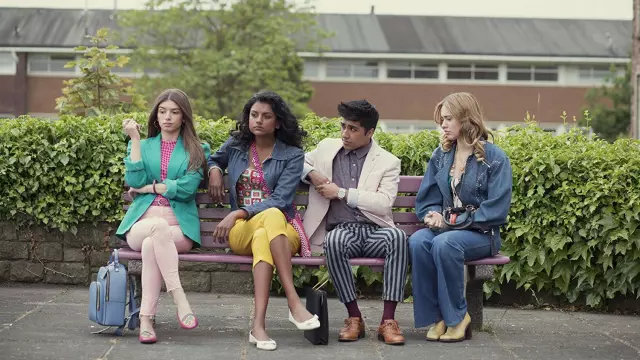 Camisa púrpura estampada de Anwar (Chaneil Kular) como se ve en Sex Education S01E01
