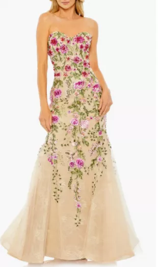 Mac Duggal Vestido de sirena sin tirantes bordado floral usado por Jenn Tran como se ve en The Bachelorette (S21E05)