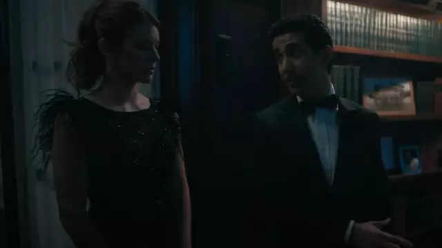 Vestido adornado con hombros de plumas de Mac Duggal usado por Phoebe (Molly Kunz) como se ve en The Irrational (T01E11)
