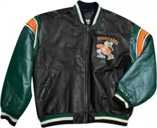 Mirage 1995 Miami Hurricanes Chaqueta de cuero negro vintage usada por Denzel Curry en Denzel Curry - RICKY