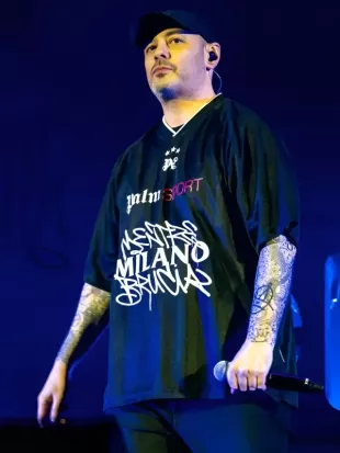 Camiseta negra de Fabri Fibra MILANO en el videoclip Fabri Fibra - In Italia 2024 (#rilive Milano 2025)