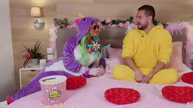 Traje de pijama para adultos Purple Kigurumi Unicorn de Laam en el video "Laam and Jeremstar's Pajama Party" de Jeremstar