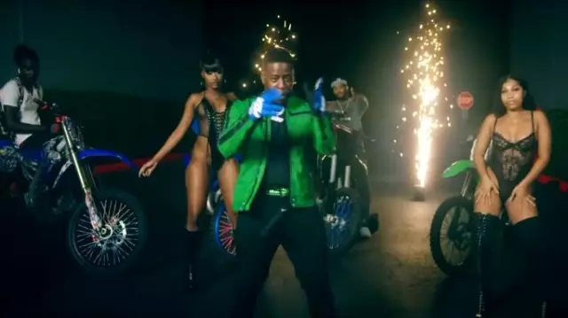 Chaqueta de moto de cuero verde neón Diesel usada por Blac Youngsta en Moneybagg Yo, Blac Youngsta – Super Hot (Video musical oficial)