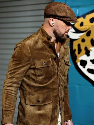 Chaqueta de gamuza marrón usada por Travis Kelce en The Travis Kelce, Patrick Mahomes & Andy Reid CONVERSACIÓN EXTENDIDA | Cuenta regresiva del lunes por la noche