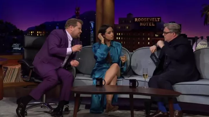 Veste en soie bleue portée par Camila Cabello comme on le voit dans The Late Late Show avec James CordenProposer un produitwanted
