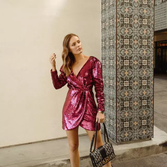 La robe cache coeur à sequins rose portée par Charlotte Bridgeman sur le compte Instagram de @charlottebridgeman