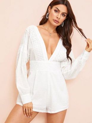 Combishort à pois dos-nu avec col V et pièces en dentelle