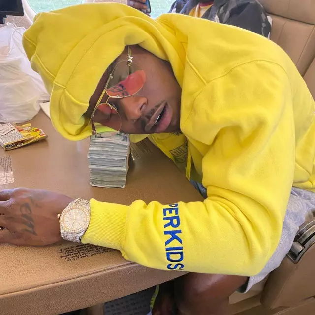 Le sweatshirt à capuche jaune KidSuper Studios porté par DaBaby sur son compte Instagram @dababy