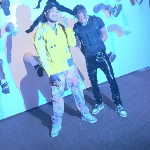 1017 ALYX 9SM Noir logo imprimé à manches courtes T-shirt de Travis Scott sur l'Instagram account @quavohuncho