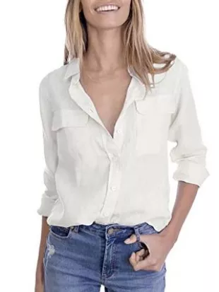 FaroDor Women's Casual V Neck Button Down Shirts Loose Fit Long Sleeve Blouses Tops with Pocket White XX-Large