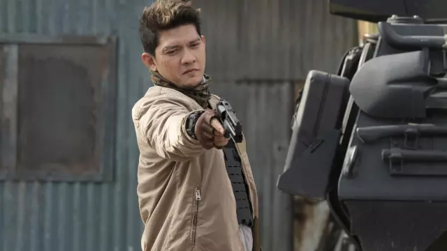 Veste bomber beige portée par Rahmat (Iko Uwais) comme on le voit dans Expend4bles