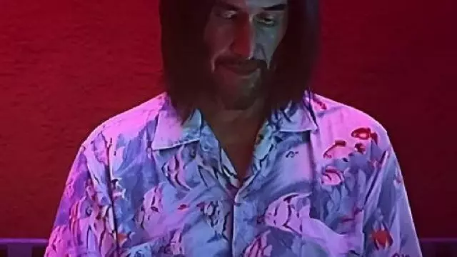 Chemise hawaïenne imprimée Good Fortune Fish portée par Gabriel (Keanu Reeves) comme on le voit dans Good Fortune