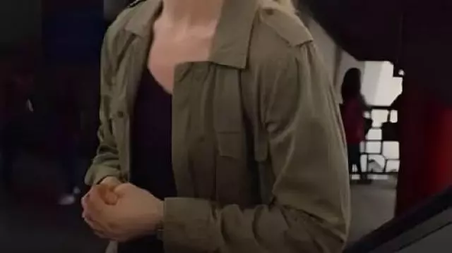 Veste vert olive ba­layée por­tée par Whit­ney (Lily James) comme on le voit dans Swi­ped