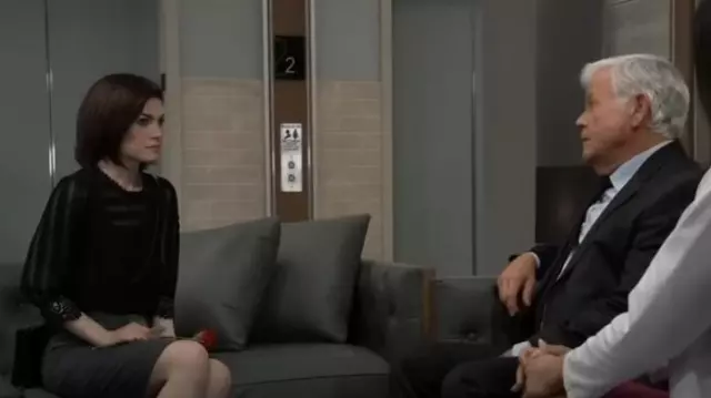 Combinaison Express Lace Bib Thong portée par Elizabeth Webber (Rebecca Herbst) vue à l’hôpital général le 23 mars 2023