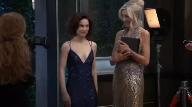 Robe ajustée en jersey strass Sherrihill portée par Elizabeth Webber (Rebecca Herbst) vue à l’hôpital général le 3 avril 2023