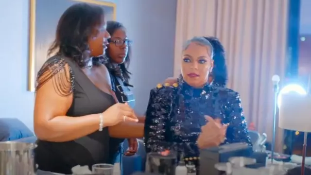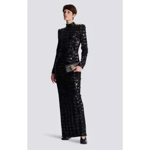 Balmain Noir Paillettes Bouton Or Col Haut Longue Ajustée Maxi Robe Longue Portée par Ashanti comme on le voit dans Nelly & Ashanti : We Belong Together (S01E06)