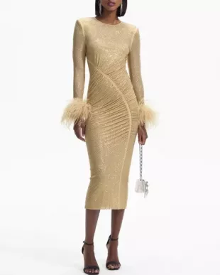 Robe midi autoportrait en plume de strass en or portée par Sherri Shepherd telle que vue dans Sherri le 20 novembre 2025