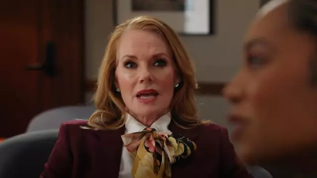 Cadre des années 70 chemise boutonnée en soie au point de contraste portée par Lisa Benner (Marg Helgenberger) comme on le voit dans All Rise (S03E18)