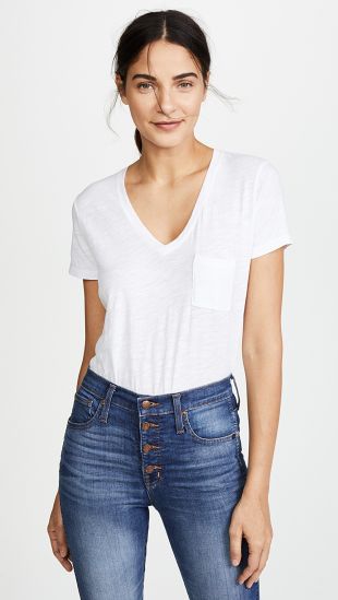 Blanc court p v neck tee porté par Edie Palmer (Megalyn Echikunwoke) dans Près de Famille Saison 1 Épisode 10
