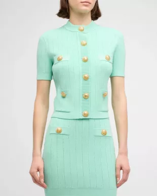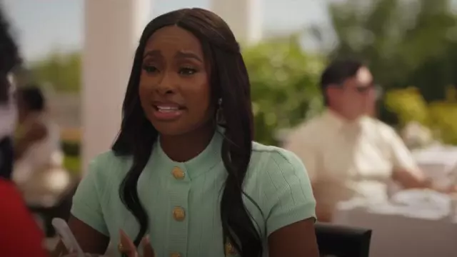 Cardigan en maille côtelée pointelle boutonnée à manches courtes Balmain porté par Hilary Banks (Coco Jones) comme on le voit dans Bel-Air (S03E09)