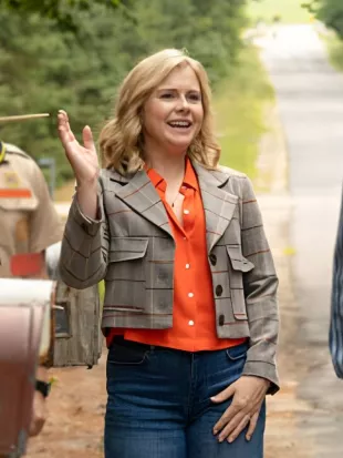 Ghosts US S5 Rose McIver Veste courte à carreaux portée par Samantha Arondekar (Rose McIver) dans Ghosts