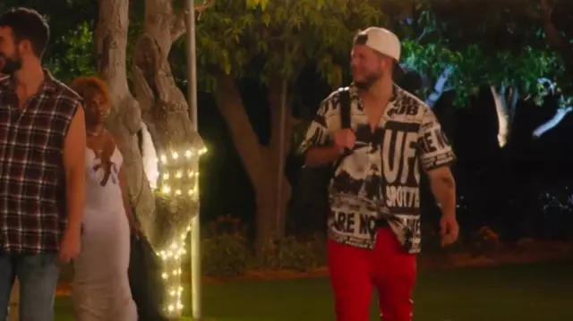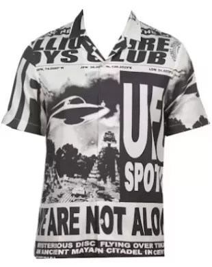 Billionaire Boys Club Chemise à manches courtes imprimée OVNI noire / blanche portée par Stephen Kirk comme on le voit dans Hitmakers (S01E06)