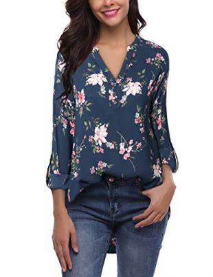 Lotusmile Womens Tops and Blouses 3/4 Sleeve Casual Mandarin Collar Shirt Flare Floral Printed Leggings Blouses for Women Soft Comfy Daily Wear Going Out Shirts Flowy Chiffon Tunic(Blue Pink,XL)