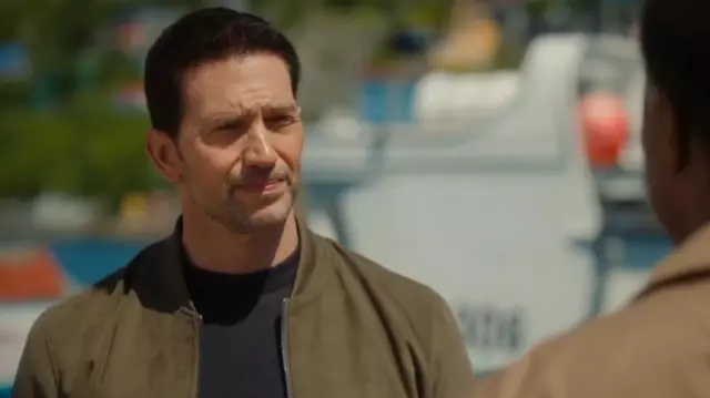 Blouson aviateur en daim Maverick Suede Olive Green Butter porté par Mark Hudson (Luke Roberts) comme on le voit dans Hudson & Rex