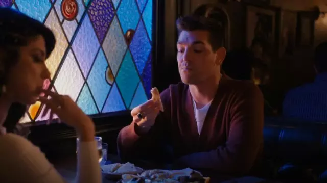 Sandro Wheat Embroidered Wool Blend Cardigan porté par Darcy Leeds (Matt Rogers) comme on le voit dans I Love That for You (S01E03)