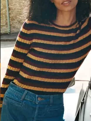 Nobody Wants This S2 Kristen Bell Pull rayé porté par Joanne (Kristen Bell) comme on le voit dans Nobody Wants This (S02E01)