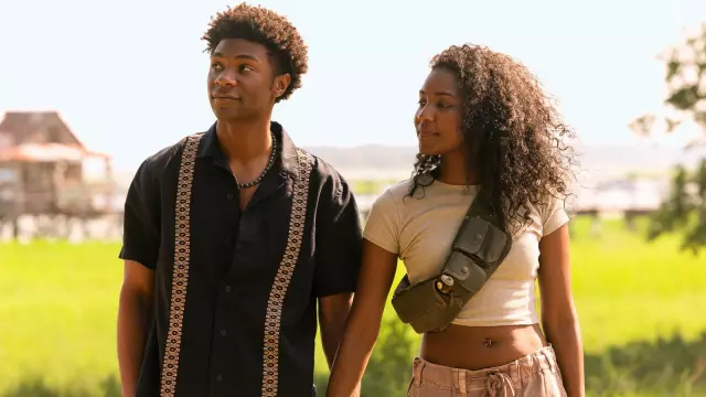 Tenues d’Outer Banks Saison 4 : Le pape Heyward (Jonathan Daviss) porte une chemise rayée noire de Banana Republic