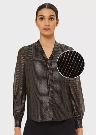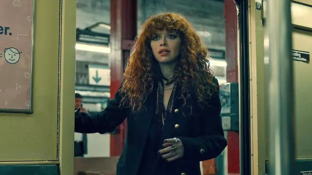 Chemisier rayé noir et or Hobbs porté par Nadia Vulvokov (Natasha Lyonne) dans la garde-robe de la série télévisée Russian Doll (Saison 2 Episode 1)