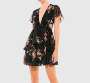 Mac Duggal Mini robe à volants à volants à imprimé floral à manches papillon portée par Jenn Tran comme on le voit dans The Bachelorette (S21E07)
