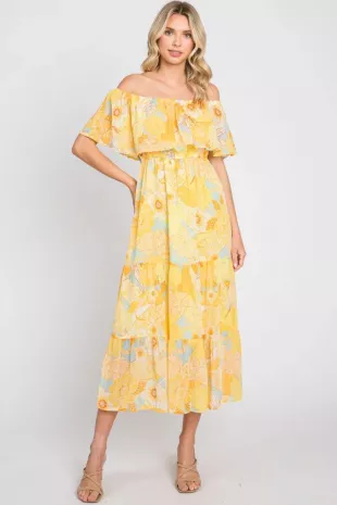 Robe midi à épaules dénudées de fleurs de maternité rose blush jaune portée par Lizzie (Sarah Dugdale) comme on le voit dans Virgin River (S06E10)