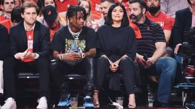 Le t-shirt Page & Plant porté par Travis Scott lors du match NBA des Houston Rockets contre Minessota en avril 2018 avec Kylie Jenner