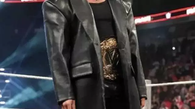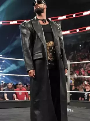 Manteau long en cuir noir porté par Seth Rollins au Lenovo Center lundi soir RAW 2025